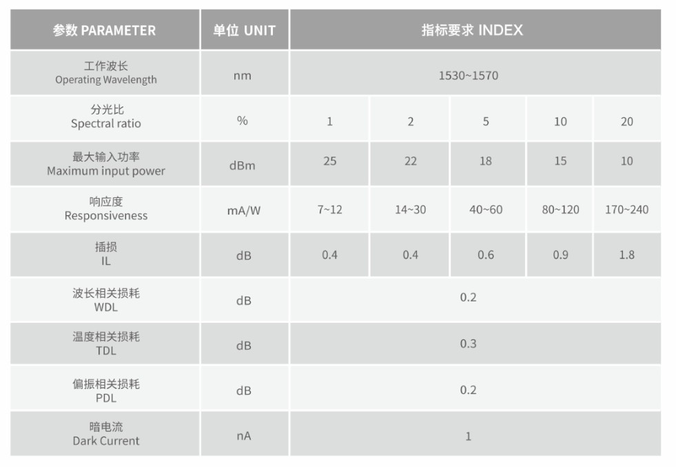 雙芯尾纖式結構,實現(xiàn)一定比例的光透射到探測器,其余的光反射到另一根光纖。用于WDM網(wǎng)絡監(jiān)控、光纖放大器、光開關等。