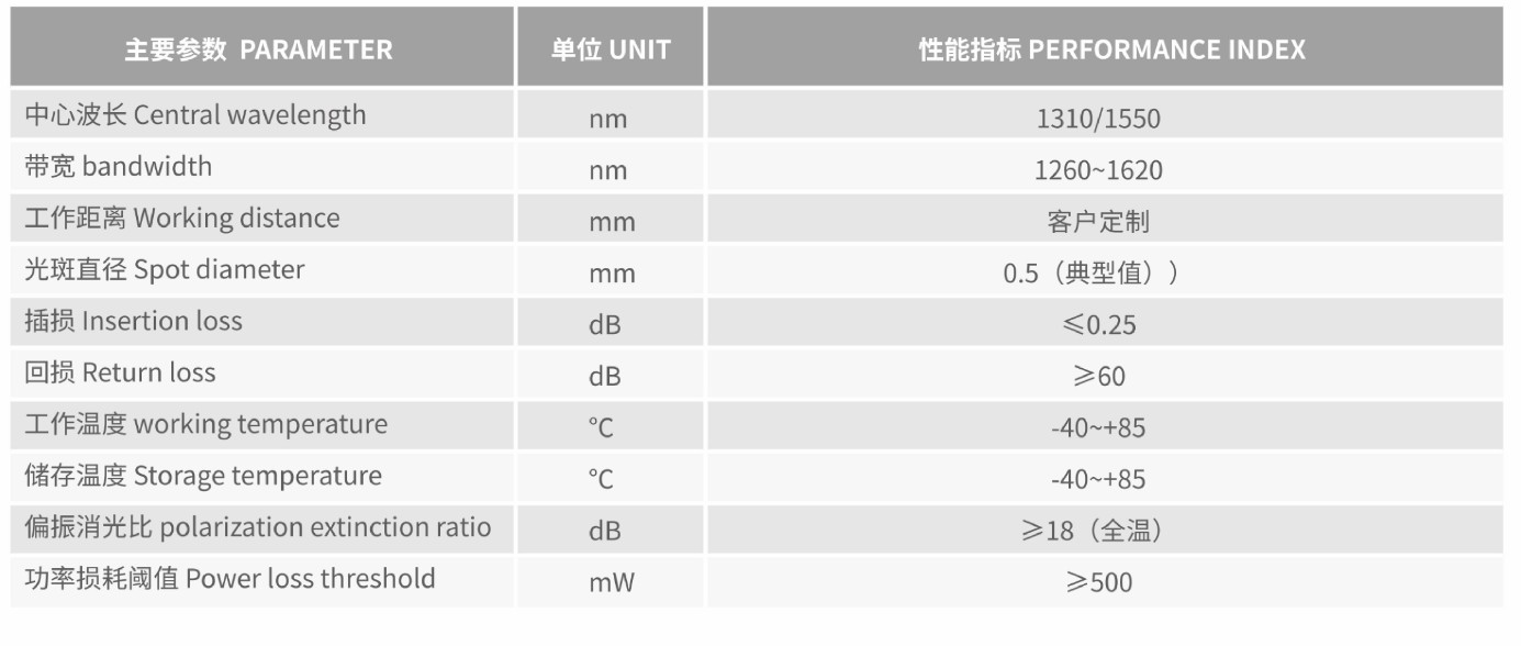 保偏光纖準(zhǔn)直器屬于光纖通訊光器件的用于輸入輸岀的一個光學(xué)元器件,光纖傳出的發(fā)散光裝置通過前置的類似凸透鏡變成平行光(高斯光束)。它的作用是使光最大效率的耦合進入所需的器件中或易如接受光信號最大效率的接受。